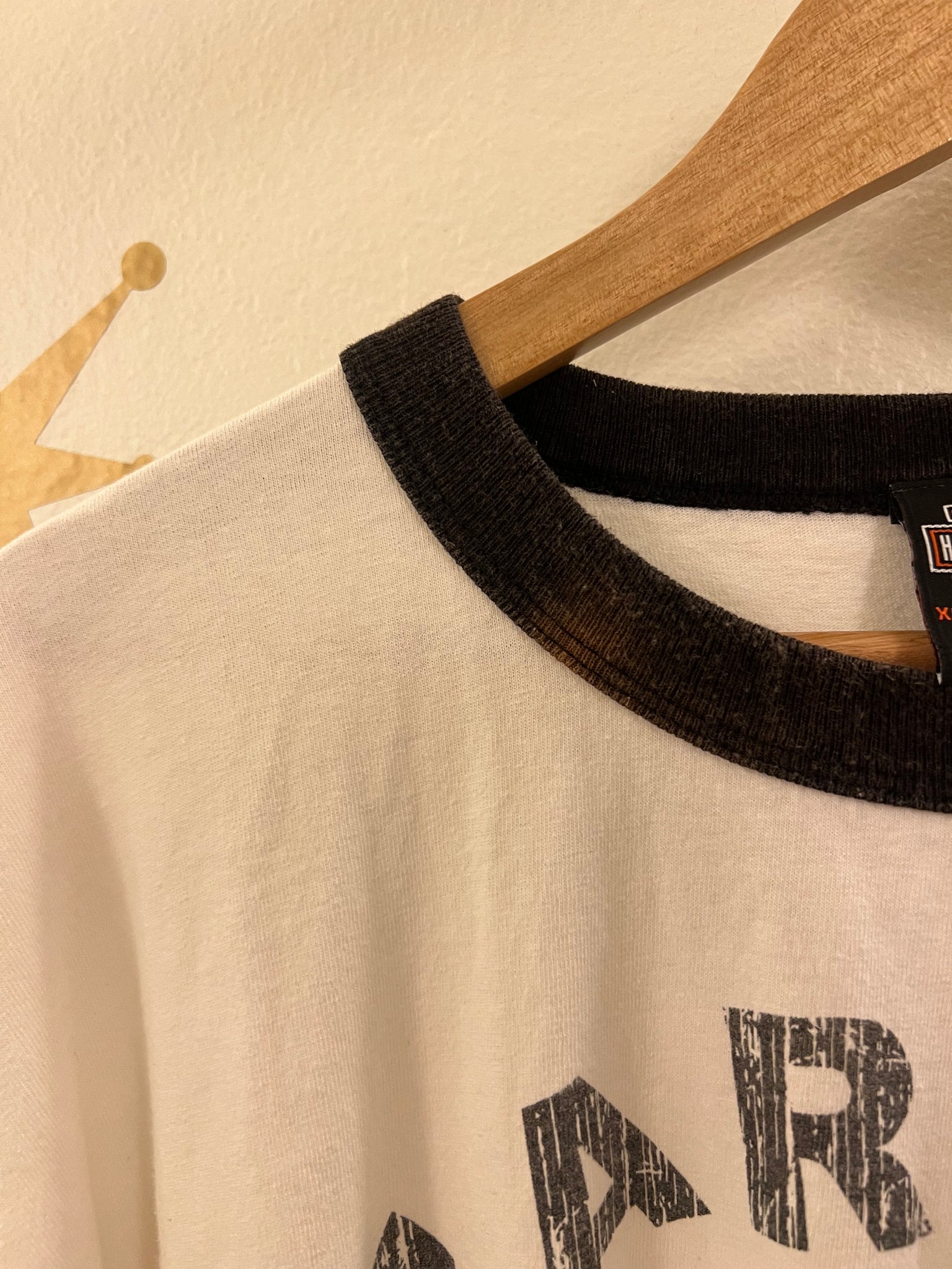 White/black ringer Harley Tee with checkered flags and left arm Harley emblem - XL - 100% cotton. Slight discoloration on the neck ring, see photo